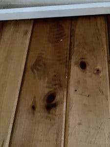 boot. It is there from a time, in 1955 or 1956, when the camp was still being built, when someone stepped, with a muddy—or maybe greasy—work boot, onto a pile of pine boards that would later be used to panel the bedroom. I am certain the footprint is my father’s. When I wake up in the morning and see it in the dim light, I imagine my mother awakening alone in that same room for 45 summers, looking up and seeing that same footprint, and I imagine I know what she thought and felt.