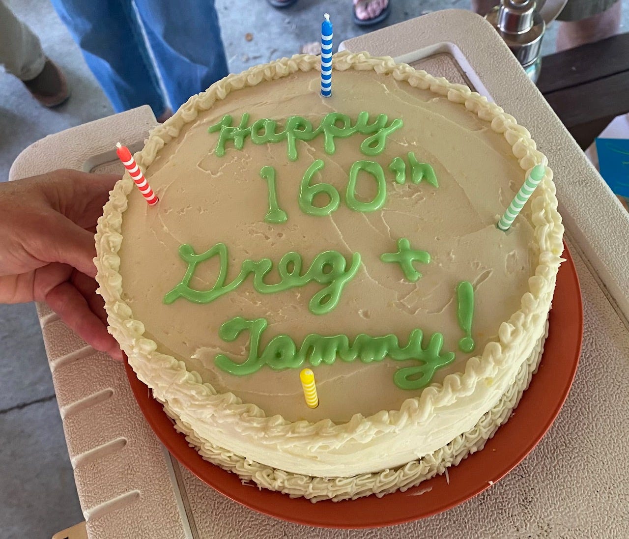 Tony, Will, and I gathered with about 20 of my family members last Wednesday to help my brother Greg and sister-in-law Tammy celebrate their 80th birthdays. Tammy’s birthday was actually in March, and Greg’s is coming up on September 27 (the same day as Will and Rosemary’s wedding), but they decided to celebrate them both in between, when my nephew Michael and his family were back east for a visit from their home in Colorado. Greg and Tammy and family were spending the week in Kennebunk, and we all gathered at a nearby park. I brought a birthday cake, and although I know Greg would have preferred his favorite, lemon meringue pie, I made one of my specialties, a lemon-frosted, lemon-filled lemon cake, which was a pretty big hit.