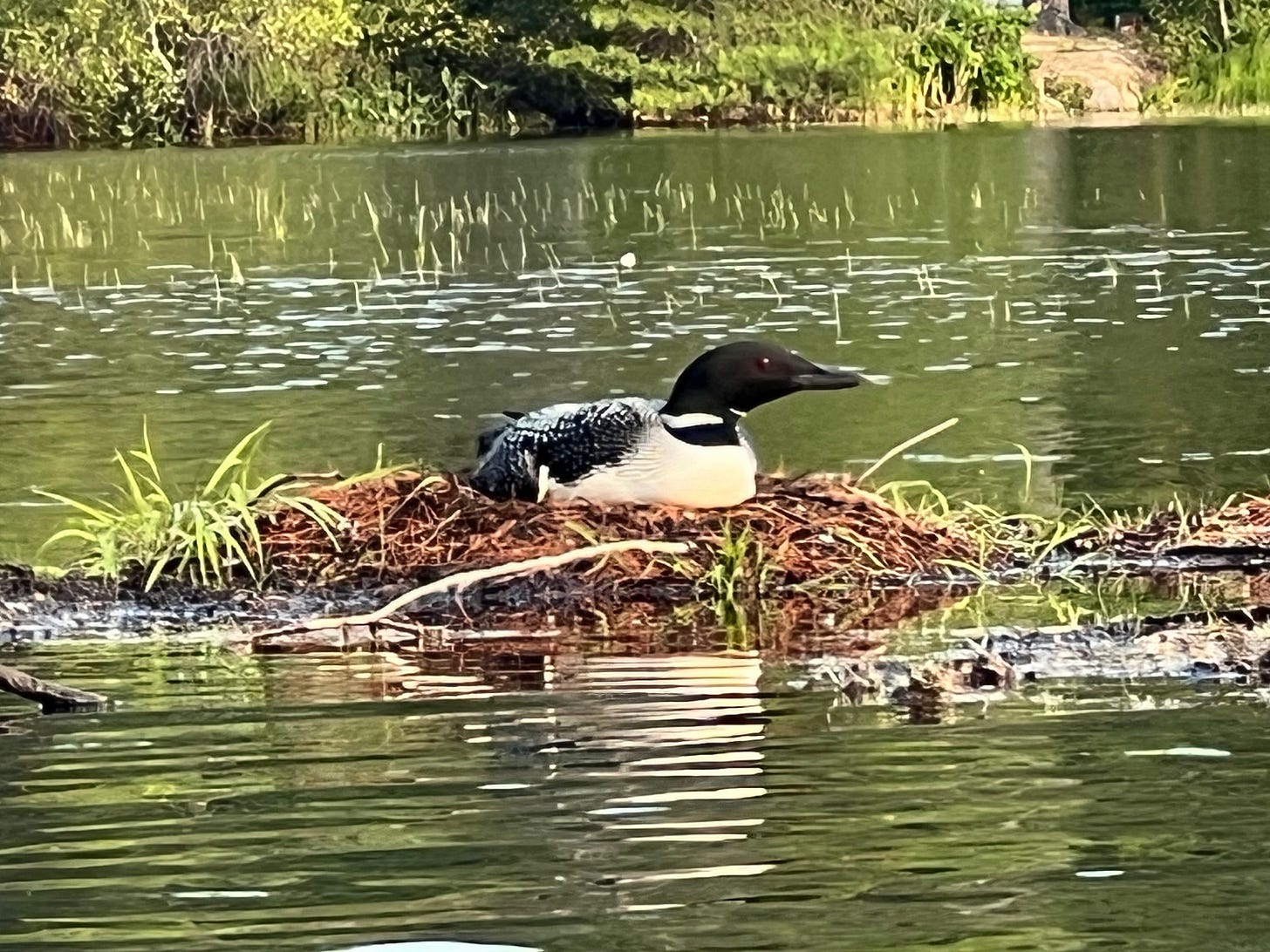 When I kayaked past on Saturday afternoon, I saw that one of the loon pair (let’s say it was the mom) was still sitting on the nest, and the other was in the water nearby. It wasn’t until I came back by that I noticed that the dad was carrying a tiny chick on his back. When I checked again early on Sunday morning, the mom was still on the nest and the dad and the first baby were still sticking close by. Just a little while later, someone posted a photo on Facebook of a chick in the nest beside the mom, so either it had hatched earlier and she was hiding it, or it hatched between the time I paddled by and the time someone (with a better camera) went by later that morning.