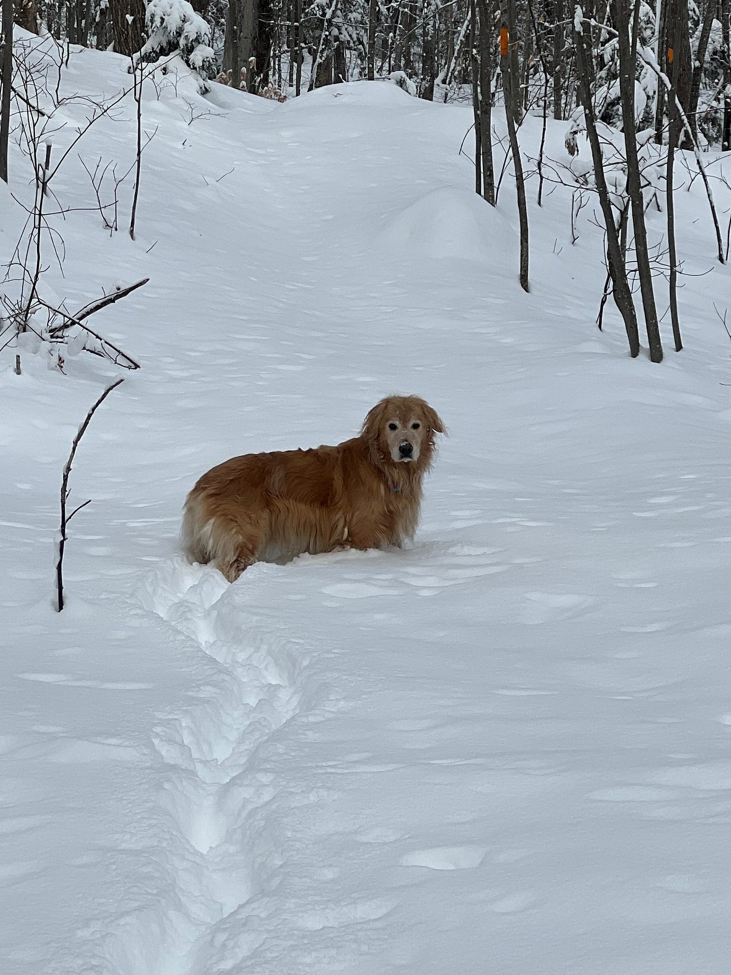 Eli the Wonder Pup and I continued our streak of Christmas Day hikes with our ninth annual one, a short snowshoe hike on the Orange Trail in Maggie’s Nature Park. It was the first time on snowshoes for my new knees, and they held up well. We broke out the trail in fresh powder snow, and the 1.3 mile loop was plenty of exercise for both of us.