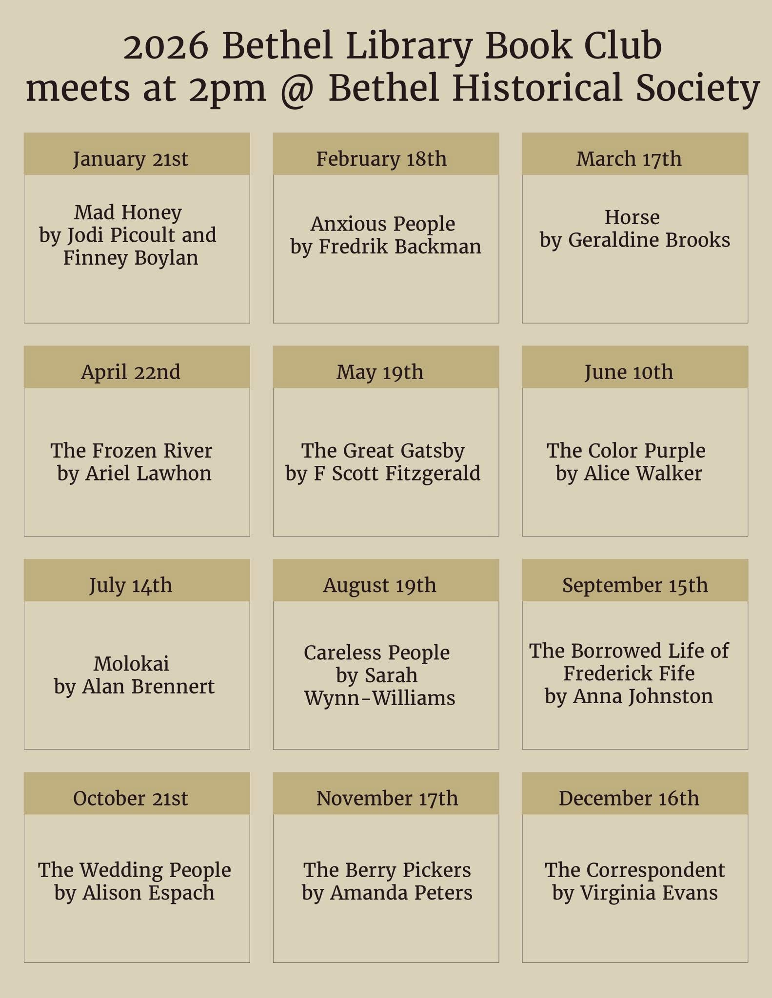 The Bethel Library Book Club meets monthly at 2 p.m. in the Reading Room of the Museums of the Bethel Historical Society’s Robinson House, next door to the library. The Reading Room is located in the back of the building, with access through the rear door on the driveway side, and plenty of parking behind the building or on Broad Street. The first meeting of 2026 will be held on Wednesday, January 21, at 2 p.m., and the book is Mad Honey, by Jodi Picoult and Jennifer Finney Boylan.