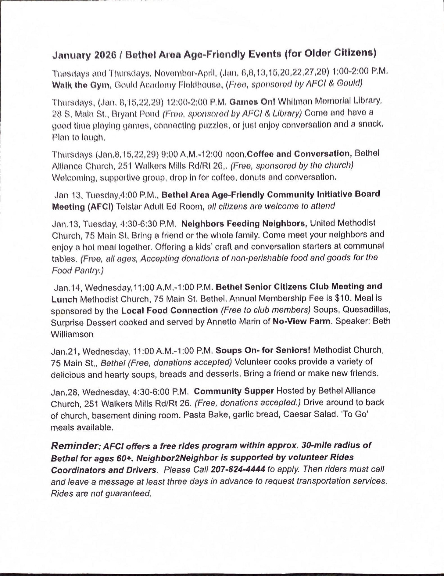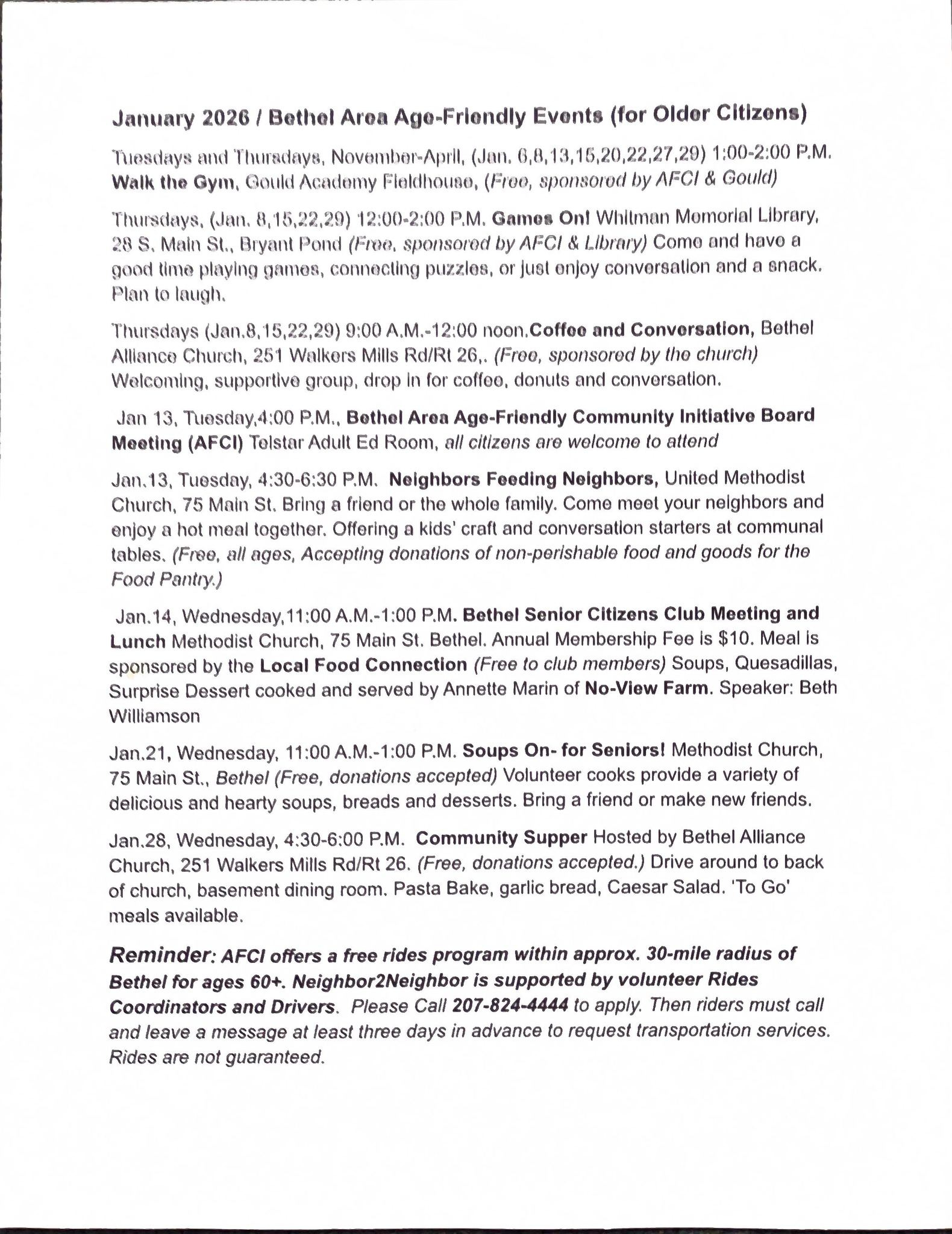 AFCI also creates a monthly calendar to let people know what other opportunities and services are available for older citizens in our area. Here’s the schedule for January. Although we’re halfway through the month, and some of these events have already taken place, this should give you an idea of how many great programs are taking place throughout our communities.