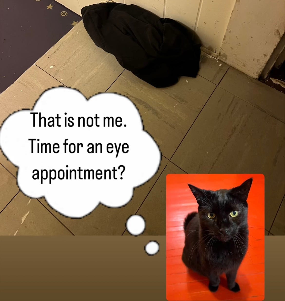 I’m overdue for an eye exam, and my cat Carl would agree that it’s time. The other morning I dropped a pair of black shorts on the floor at the top of the stairs so I’d remember to take them down to add to the laundry, and before I got around to going downstairs, I had walked by, glanced at them, and said, “Hi, Carl!” to them…not once, but twice.