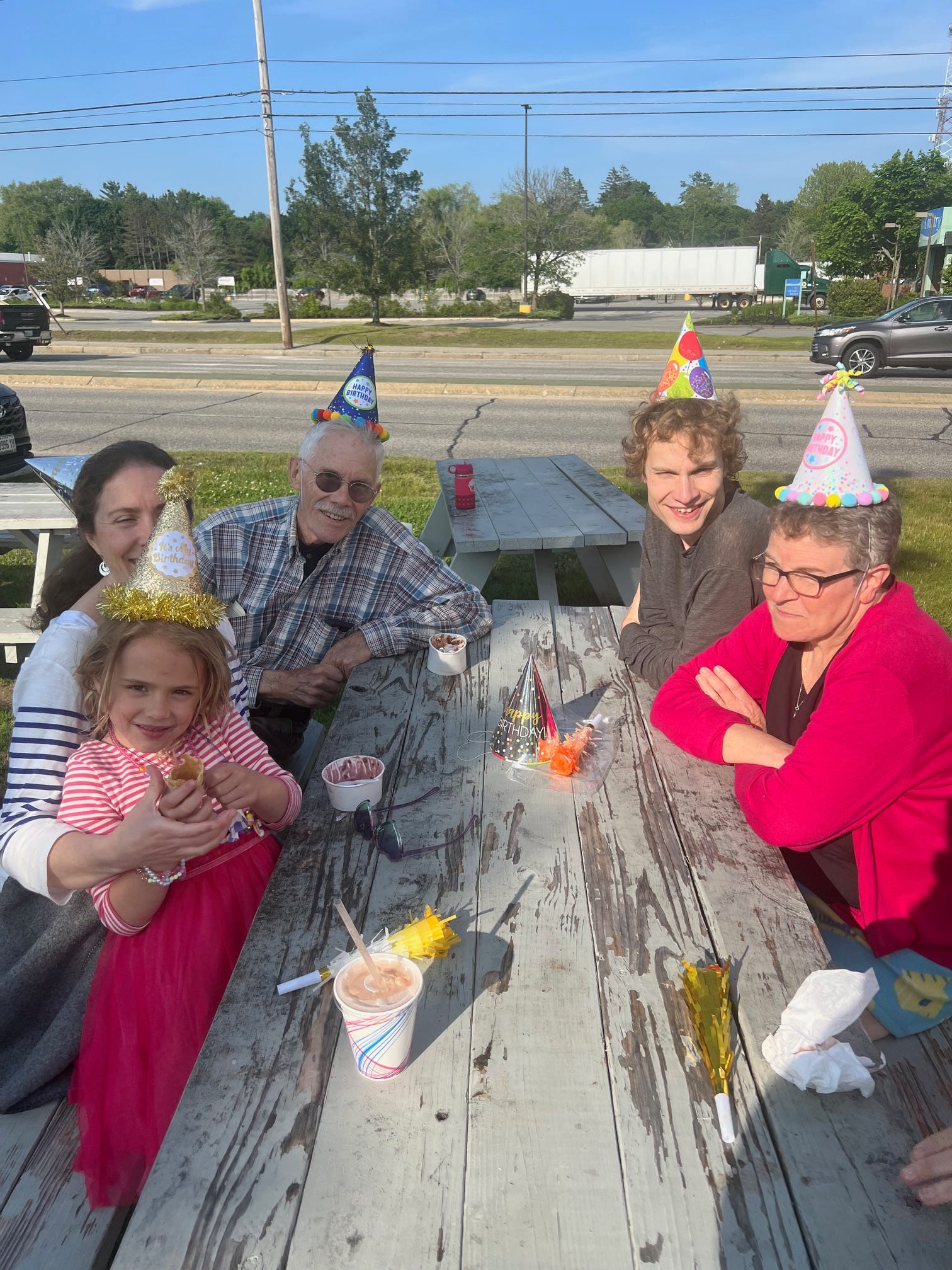 It’s been a busy week! Tony, Will, and I went to Portland last Saturday for granddaughter Lila’s dance recital, followed by a family pizza party lunch as an early celebration of her seventh birthday (which was June 16), a backyard soccer game at her house, and a trip to Lib’s Dairy Treats, where we all wore party hats and enjoyed our ice cream at a picnic table, despite the less-than-summerlike weather.