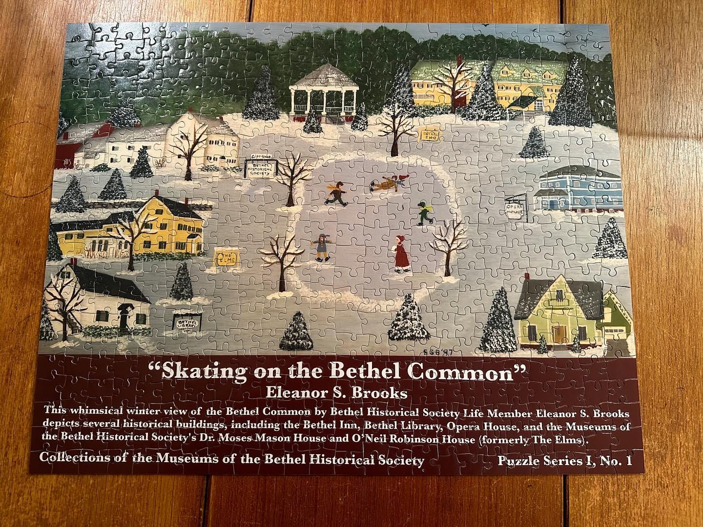 In December of 2023, I reported that the Museums of the Bethel Historical Society had discovered online and purchased a wonderful painting, “Skating on the Bethel Common,” done by Eleanor Brooks in 1997, and was having it made into a 500-piece jigsaw puzzle. “The whimsical folk art painting depicts a winter scene of the Bethel Common, with the historical society, the Bethel Inn, the library, and other familiar buildings.”