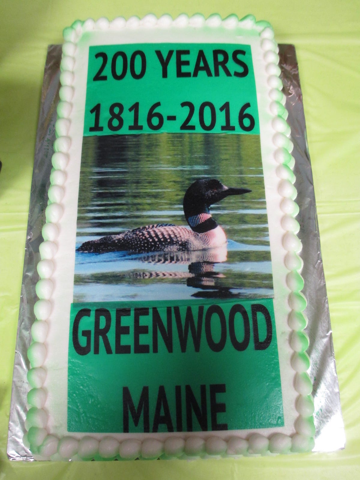 We had just celebrated Greenwood’s official 200th birthday, with cake and ice cream following the previous week’s selectmen’s meeting, the kickoff to our bicentennial celebration year. “Sally Smith made the cake, with a photo of a loon that I had taken a couple of summers ago on the top. Using edible ink and special “paper” made out of sugar, she can transfer any photo to a cake. Modern technology never ceases to amaze me!”