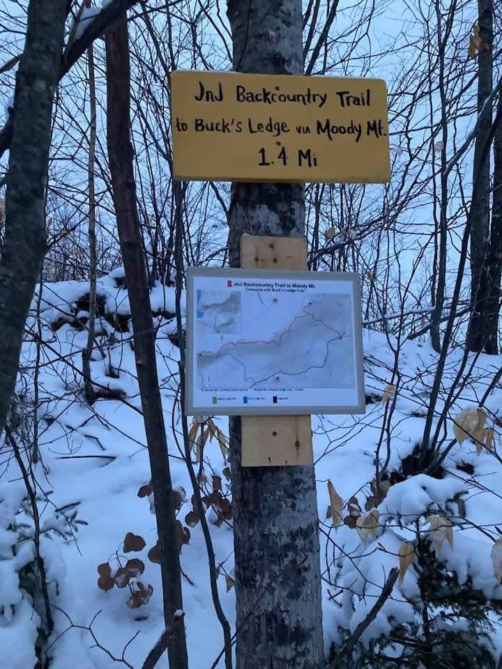 A few days before, I had done an early-morning hike of Moody Mountain by way of the newly created J&J Backcountry Trail, starting out with a headlamp about 45 minutes before sunrise, and I reported that “Jurgen and Janice Marks, who created the trail, have recently added excellent signage at all of the trail junctions. They had been up it the day before my hike, and their tracks, as well as pink flagging and the new signs, made it easy to follow the trail.”