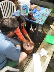 We had plenty of food—because what’s a weekend at camp without celebratory food?—waffles and pancakes and muffins for breakfast, the usual grilled Fourth of July fare (supplemented with moose sausage, veggie burgers, and tofu pups), lobsters for dinner on Saturday, sandwiches and salads and snacks, and desserts, of course—chocolate cake and homemade ice cream (made with our own organically grown strawberries) and strawberry shortcake.